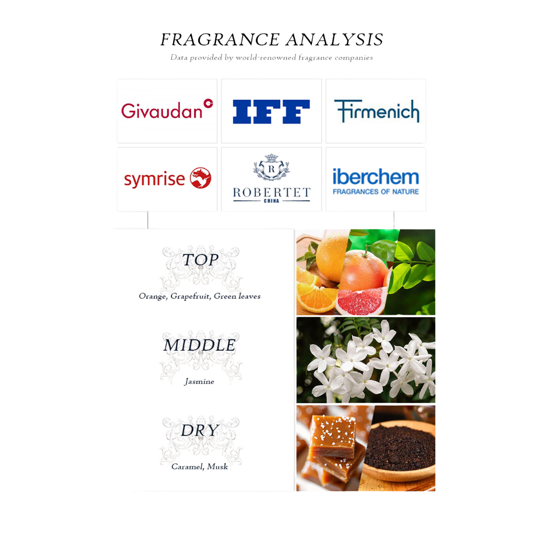 The fragrance opens with a bright, energizing blend of sweet orange, grapefruit, and fresh green leaves, creating an uplifting citrus freshness. At the heart, jasmine blooms softly, adding floral elegance and feminine charm. The scent settles into a warm, indulgent base of creamy caramel and sensual musk, leaving a subtle yet alluring trail that lingers throughout the day.